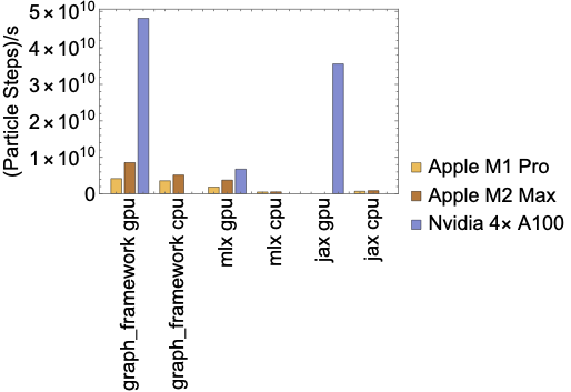 We compared the graph framework against the MLX framework since it supports Apple GPUs and JAX due to it's popularity. Source codes for this benchmark case is available in the appendix. Figure fig:compare} shows the through put of pushing $10^{8}$ particles for $10^{3}$ time steps. The graph framework consistently shows the best throughput on both CPUs and GPUs. Note MLX CPU throughput could by improved by splitting the problem to multiple threads.