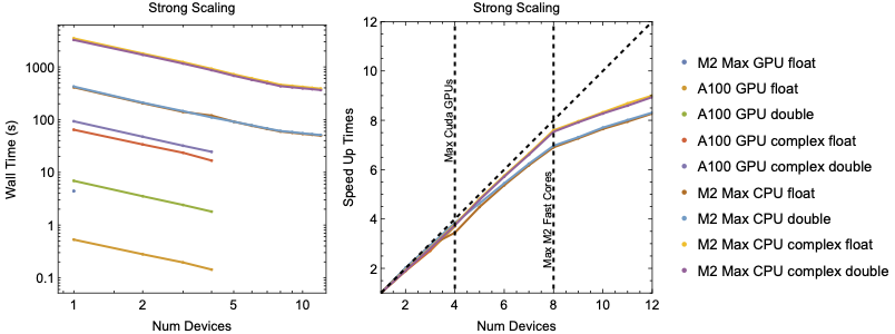 The figure above shows the advantage even a single GPU has over CPU execution. In single precision, the M2's GPU is almost \(100\times\) faster a single CPU core while the a single A100 has a nearly $800\times$ advantage. An interesting thing to note is the M2 Max CPU show no advantage between single and double precision execution.