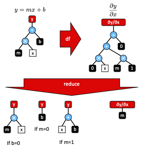 Each time an expression is built, the reduce method is called to simplify the graph. For instance, a graph consisting of constant added to a constant will be reduced to a single constant by calling the evaluate method. Sub-graph expressions are combined, factored out, or moved to enable better reductions on subsequent passes. As new ways of reducing the graph are implemented, current and existing code built using this framework benefit from improved speed. The figure above shows a visualization of the tree data structure for the equation of a line, the derivative, and the subsequent reductions.